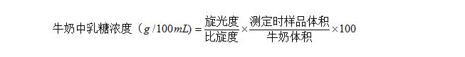 取50mL牛奶樣品于100mL容量瓶中,加乙酸鉛和亞鐵氰化鉀溶液、冰乙酸各2mL,搖勻后靜置30min,用干燥濾紙過濾,棄去初濾液,測定其旋光度,記錄數據。